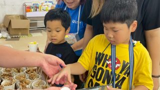 まずはみんなで野菜を切って下ごしらえ。おにぎりと焼きそばを作ったら準備完了!